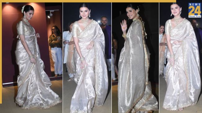 सोशल मीडिया पर सामने आई फोटोज में तारा सुतारिया को शिमरी साड़ी में देखा गया. इसमें उनका लुक देखते ही बन रहा है. इवेंट में एक्ट्रेस ने अपने इस लुक से सारी लाइमलाइट ही चुरा ली. जब उन्होंने साड़ी में एंट्री की तो सभी पैपराजी का कैमरा तारा की ओर से घूम गया. (Photo- Tahir Jasus)