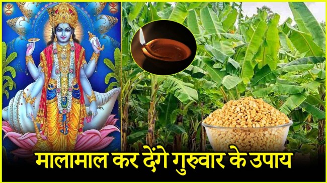 рдЧреБрд░реБрд╡рд╛рд░ рдХреЛ рд╕реВрд░реНрдпрд╛рд╕реНрдд рдХреЗ рдмрд╛рдж рднрдЧрд╡рд╛рди рд╡рд┐рд╖реНрдгреБ рдХреЗ рдордВрджрд┐рд░ рдореЗрдВ рдпрд╛ рдШрд░ рдХреЗ рдкреВрдЬрд╛ рд╕реНрдерд▓ рдкрд░ рдЪрдиреЗ рдХреА рджрд╛рд▓ рдХреЗ рдвреЗрд░ рдкрд░ рдПрдХ рдЫреЛрдЯрд╛ рдорд┐рдЯреНрдЯреА рдХрд╛ рджреАрдкрдХ рдЬрд▓рд╛рдПрдВред рджреАрдкрдХ рдореЗрдВ рдШреА рдФрд░ рдПрдХ рдЫреЛрдЯреА рд╕реА рдХреЗрд╕рд░ рдХреА рдбрдВрдбреА рдбрд╛рд▓реЗрдВред рджреАрдкрдХ рдЬрд▓рд╛рддреЗ рд╕рдордп ‘реР рд▓рдХреНрд╖реНрдореА рдирд╛рд░рд╛рдпрдгрд╛рдп рдирдордГ’ рдордВрддреНрд░ рдХрд╛ 11 рдмрд╛рд░ рдЬрд╛рдк рдХрд░реЗрдВред рдпрд╣ рдЙрдкрд╛рдп рдШрд░ рдореЗрдВ рдзрди рдХреА рдмрд░рдХрдд рдФрд░ рдиреМрдХрд░реА рдореЗрдВ рдкреНрд░рдореЛрд╢рди рдХреЗ рд▓рд┐рдП рдЕрд╕рд░рджрд╛рд░ рд╣реИред рдЪрдиреЗ рдХреА рджрд╛рд▓ рдФрд░ рдХреЗрд╕рд░ рдХрд╛ рд╕рдВрдпреЛрдЬрди рдорд╛рддрд╛ рд▓рдХреНрд╖реНрдореА рдФрд░ рдЧреБрд░реБ рдЧреНрд░рд╣ рдХреЛ рдкреНрд░рд╕рдиреНрди рдХрд░рддрд╛ рд╣реИ, рдЬрд┐рд╕рд╕реЗ рдЖрд░реНрдерд┐рдХ рд╕реНрдерд┐рд░рддрд╛ рдЖрддреА рд╣реИред