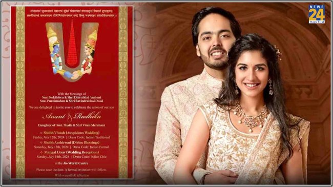 अनंत अंबानी और राधिका मर्चेंट की शादी का कार्ड गहरे लाल रंग का है, जिस पर सुनहरे और श्वेत अक्षरों से वेडिंग प्रोग्राम और ड्रेस कोड भी दिया हुआ है। कार्ड पर छपे संदेश के अनुसार, समारोह का शुभारंभ 12 जुलाई को शुभ विवाह से होगा, जिसके लिए ‘इंडियन ट्रेडिशनल’ ड्रेस कोड निर्धारित किया गया है। वहीं, 13 जुलाई को होने वाले आशीर्वाद समारोह के लिए ‘इंडियन फॉर्मल’ ड्रेस कोड तय किया गया है, तो 14 जुलाई को मंगल उत्सव यानी रिसेप्शन के दिन लिए ड्रेस कोड ‘इंडियन चिक’ रखा गया है।