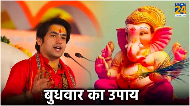 बुधवार के दिन भगवान गणेश की पूजा की जाती है। बागेश्वर धाम के धीरेंद्र शास्त्री के अनुसार आप बुधवार को गणपति को खुश करने के लिए उपाय अपना सकते हैं। आपको बुधवार को दूर्वा घास लेनी है और उसकी माला बनाकर गणपति जी को चढ़ानी है, आप चाहें तो गणेश जी को दूर्वा घास की माला भी पहना सकते हैं। ऐसा करने से आप पर गणेश जी और उनकी पत्नियां रिद्धि-सिद्धि की कृपा बनी रहेगी। साथ ही उस व्यक्ति के घर से कभी भी रिद्धि-सिद्धि नहीं जाती है।