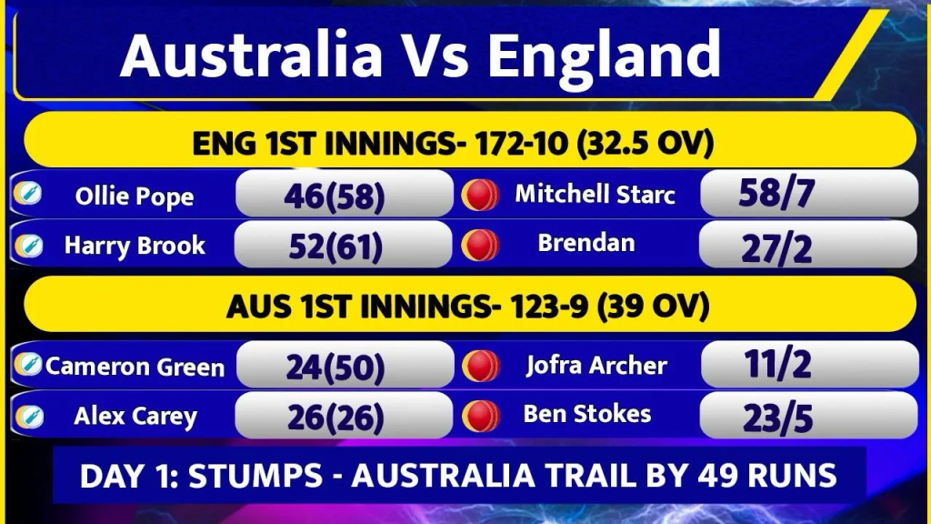 वहीं, 123 रनों का पीछा करते हुए ऑस्ट्रेलिया 39 ओवर में पहले दिन का खेल खत्म होने तक 123 रन बना चुकी है. फिलहाल ऑस्ट्रेलिया 49 रनों से पीछे है. दूसरे दिन इंग्लैंड के गेंदबाज ऑस्ट्रेलिया को जल्द से जल्द समेटना चाहेंगे.