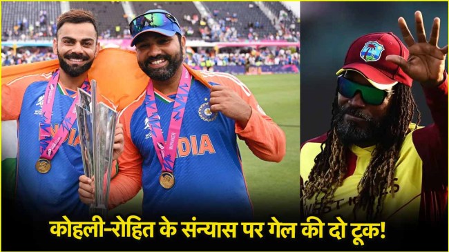 Kohli-Rohit Retirement Gayle: रोहित शर्मा और विराट कोहली के रिटायरमेंट को लेकर इन दिनों जमकर चर्चा हो रही है। हिटमैन टी-20 क्रिकेट को अलविदा कह चुके हैं, लेकिन वनडे और टेस्ट में वह रनों के लिए बुरी तरह से जूझ रहे हैं। खासतौर पर टेस्ट क्रिकेट में रोहित का हाल बेहाल है। क्रिकेट के सबसे लंबे फॉर्मेट में किंग कोहली का रिकॉर्ड भी बहुत खुश करने वाला नहीं रहा है। हालांकि, रोहित की अगुवाई में टीम इंडिया ने आईपीएल से ठीक पहले चैंपियंस ट्रॉफी के खिताब को अपने नाम किया। इस बीच, रोहित-कोहली के संन्यास को लेकर क्रिस गेल से भी सवाल पूछा गया और यूनिवर्स बॉस ने आलोचकों के मुंह पर जोरदार तमाचा जड़ने वाला रिप्लाई दे डाला।