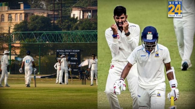 рд░рдгрдЬреА рдЯреНрд░реЙрдлреА рдореЗрдВ рдмрдВрдЧрд╛рд▓ рдХреА рднрд┐рдбрд╝рдВрдд рд╕рд░реНрд╡рд┐рд╕реЗрдЬ рдХреЗ рд╕рд╛рде рд╣реЛ рд░рд╣реА рд╣реИ. рдЕрднрд┐рдордиреНрдпреБ рдореИрдЪ рдХреЗ рдкрд╣рд▓реЗ рджрд┐рди рдмрдврд╝рд┐рдпрд╛ рдмрд▓реНрд▓реЗрдмрд╛рдЬреА рдХрд░ рд░рд╣реЗ рдереЗ рдФрд░ 81 рд░рди рдмрдирд╛ рдЪреБрдХреЗ рдереЗ. рднрд╛рд░рддреАрдп рдмрд▓реНрд▓реЗрдмрд╛рдЬ рдХрд╛ рд╢рддрдХ рд▓рдЧрд╛рдирд╛ рддрдп рд╕рд╛ рд▓рдЧ рд░рд╣рд╛ рдерд╛ред рд╣рд╛рд▓рд╛рдВрдХрд┐, рдкрд╛рд░реА рдХреЗ 41рд╡реЗрдВ рдУрд╡рд░ рдореЗрдВ рдЕрднрд┐рдордиреНрдпреБ рдХреЛ рдЕрдЬреАрдмреЛрдЧрд░реАрдм рддрд░реАрдХреЗ рд╕реЗ рд░рдирдЖрдЙрдЯ рд╣реЛрдХрд░ рдкрд╡реЗрд▓рд┐рдпрди рд▓реМрдЯрдирд╛ рдкрдбрд╝рд╛.рдЕрдм рд╣реБрдЖ рдпреВрдВ рдХрд┐ рдЕрднрд┐рдордиреНрдпреБ рдиреЙрди рд╕реНрдЯреНрд░рд╛рдЗрдХ рдкрд░ рдЦрдбрд╝реЗ рдереЗ. рдЧреЗрдВрджрдмрд╛рдЬ рдЖрджрд┐рддреНрдп рдХреБрдорд╛рд░ рдХреА рдмреЙрд▓ рдкрд░ рд╕реБрджреАрдк рдиреЗ рд╕рд╛рдордиреЗ рдХреА рддрд░рдл рд╢реЙрдЯ рд▓рдЧрд╛рдпрд╛, рдЬреЛ рд╕реАрдзрд╛ рдЧреЗрдВрджрдмрд╛рдЬ рдХреА рддрд░рдл рдЖрдИ.