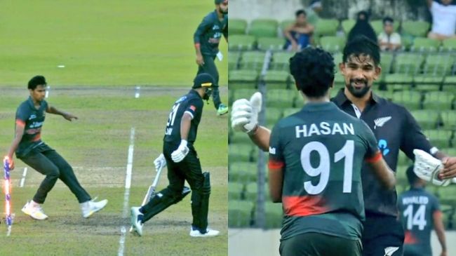 ये नजारा 46वें ओवर में देखने को मिला। हसन महमूद न्यूजीलैंड के बल्लेबाज लॉकी फर्ग्यूसन को गेंद डालने लगे तो दूसरे छोर पर खड़े ईश सोढ़ी क्रीज से आगे निकल गए। जैसे ही हसन महमूद ने सोढ़ी को आगे निकलते देखा, उन्होंने मांकडिंग के जरिए तुरंत गिल्लियां बिखेर डालीं। ईश क्रीज से आगे थे, ऐसे में उन्हें आउट करार दे दिया गया। वह मैदान से वापस लौटने लगे। सोढ़ी जाते-जाते इस मांकडिंग पर बल्ले और हाथ से तालियां बजाते रहे। शायद वे तंज करना चाहते थे। इतने में अंपायर के पास खिलाड़ियों का जमघट लग गया। लेकिन ये क्या?