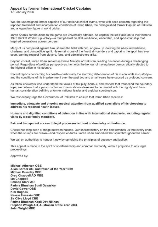 कप्तानों ने पाकिस्तान के लोकतांत्रिक तरीके से चुने गए प्रधानमंत्री के तौर पर खान के समय का भी ज़िक्र किया और इस बात पर जोर दिया कि राजनीतिक मतभेदों के बावजूद, वो इंसानी बर्ताव के हकदार हैं.न्होंने पाकिस्तान सरकार से ये एनश्योर करने की अपील की कि खान को काबिल स्पेशलिस्ट से तुरंत और लगातार मेडिकल केयर मिले, हिरासत में इंसानी हालात हों, जिसमें रेगुलर परिवार से मिलना भी शामिल हो, और बिना किसी देरी के कानूनी प्रक्रियाओं तक सही और पारदर्शी पहुंच हो.