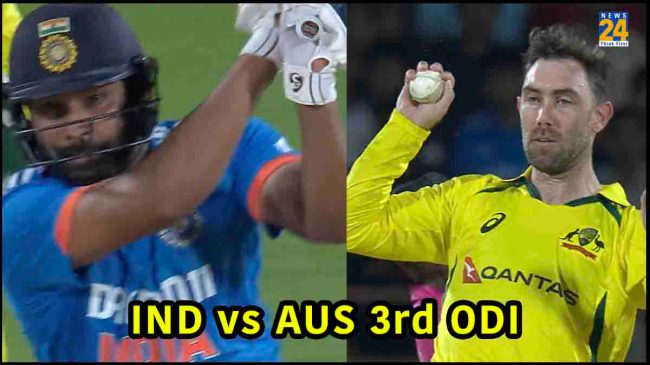 IND vs AUS 3rd ODI: भारत बनाम ऑस्ट्रेलिया के बीच तीसरा वनडे मुकाबला खेला जा रहा है। भारत के कप्तान रोहित शर्मा ने इस मैच में शानदार प्रदर्शन किया है। रोहित ने सिर्फ 57 गेंदों में 81 रनों की पारी खेली है। रोहित अपनी शतक की ओर तेजी से बढ़ रहे थे, लेकिन तभी गेंदबाजी के लिए आए ग्लेन मैक्सवेल ने रोहित को 81 रनों के निजी स्कोर पर चलता कर दिया है। ग्लेन मैक्सवेल ने खुद गेंदबाजी करते हुए रोहित का कैच भी लिया, लेकिन ताज्जुब की बात ये है कि मैक्सवेल ने कैच लिया, लेकिन उन्हें खुद यकीन नहीं हो रहा था कि उन्होंने कैच पकड़ लिया है।