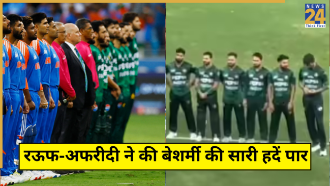 पाकिस्तान के नेशनल एंथम के बाद भारत का राष्ट्रगान बजा. दोनों देशों के खिलाड़ी सावधान खड़े थे. इसी बीच हारिस रऊफ और शाहीन अफरीदी ने बेशर्मी की सभी हदें पार कर दी. वो भारत के नेशनल एंथम के बीच आपस में बात करने लगे. इसी बीच शाहीन अफरीदी सावधान पोजीशन में भी खड़े नहीं थे. साफ तौर पर दोनों ने यहां भारत के राष्ट्रगान का अपमान किया है. पाकिस्तान हमेशा ही बेहूदा हरकतों के कारण ट्रोल होता आया है और अब उनके खिलाड़ी बेशर्म हो चुके हैं. इस तरह की गलती का उन्हें खामियाजा भुगतना पड़ सकता है. ICC द्वारा उनपर भारी जुर्माना लगाया जा सकता है.