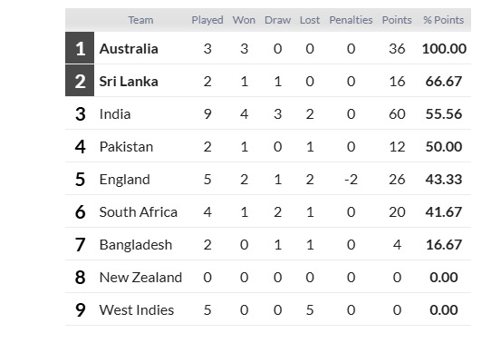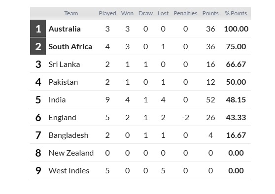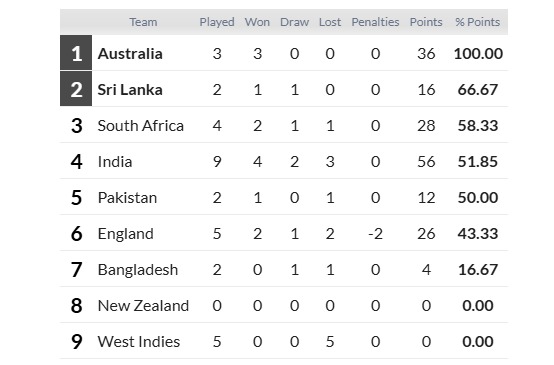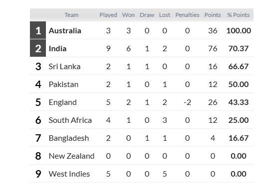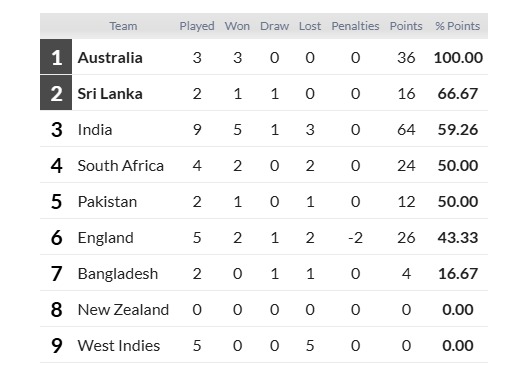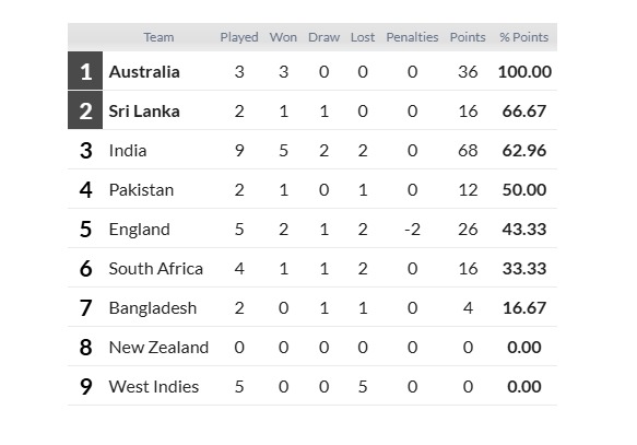 वर्ल्ड टेस्ट चैंपियनशिप का मौजूदा पॉइंट्स टेबल