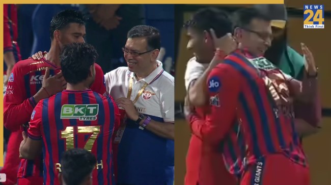 लखनऊ सुपरजाइंट्स के मालिक संजीव गोयनका अपनी टीम को सपोर्ट करना बखूबी जानते हैं. वो हर मैच के दौरान स्टैंड्स में टीम के लिए चियर करते दिखते हैं. अकसर उन्हें मैच के बाद खिलाड़ियों से बात करते हुए देखा जाता है. कोलकाता के खिलाफ मैच के हीरो रहे मुकुल चौधरी से भी उन्होंने खूब बातचीत की. जीत के बाद वो काफी खुश नजर आए और उन्होंने मुकुल को शाबाशी देते हुए गले लगाया. सोशल मीडिया पर वायरल हो रही वीडियो में दावा किया जा रहा है कि मुकुल ने उनके पैर छूने की कोशिश की लेकिन गोयनका ने उन्हें रोककर गले लगा लिया.