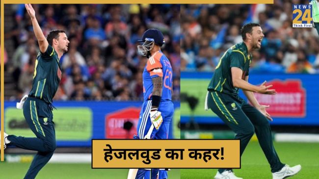 Josh Hazlewood: भारत और ऑस्ट्रेलिया के बीच 5 मैचों की टी-20 सीरीज खेली जा रही है. सीरीज का दूसरा मुकाबला भारत और ऑस्ट्रेलिया के बीच मेलबर्न में खेला जा रहा है. इस मैच में भारतीय टीम ने पहले बल्लेबाजी की और निराशाजनक प्रदर्शन किया. ऑस्ट्रेलियाई तेज गेंदबाज जोश हेजलवुड ने कमाल कर दिया. उन्होंने 3 भारतीय टॉप ऑर्डर बल्लेबाजों को पवेलियन की राह दिखाई और भारतीय बल्लेबाजी युनिट की कमर तोड़ दी.