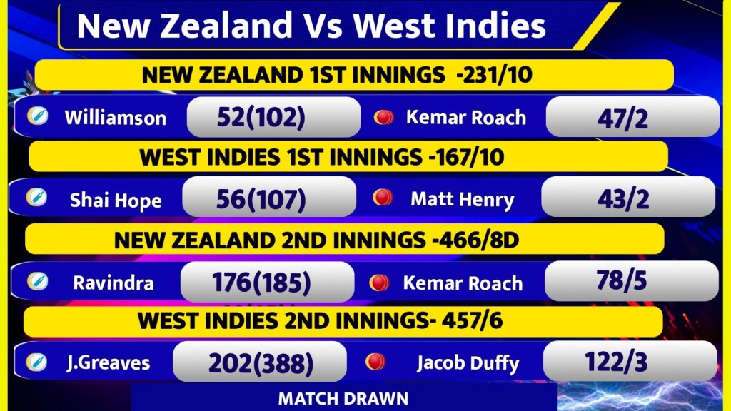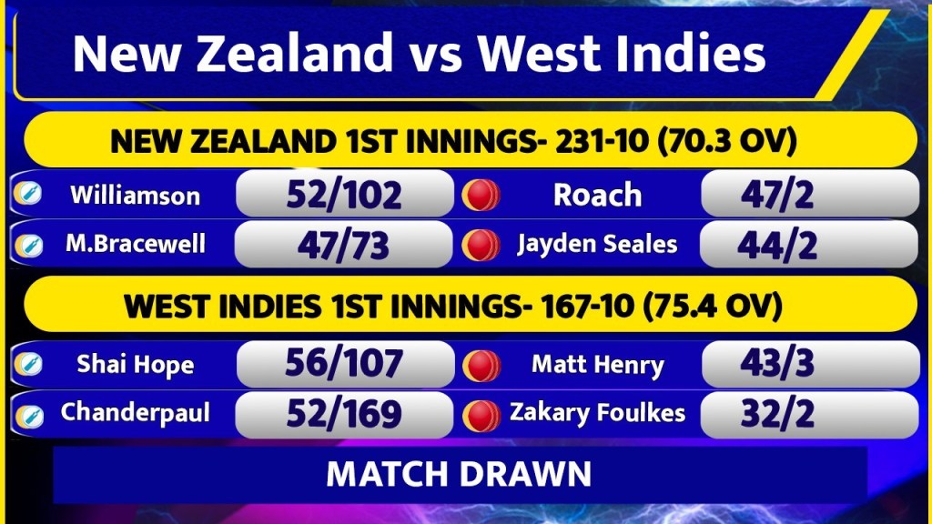 NZ vs WI, 1st Test Draw: рдиреНрдпреВрдЬреАрд▓реИрдВрдб рдФрд░ рд╡реЗрд╕реНрдЯрдЗрдВрдбреАрдЬ рдХреЗ рдмреАрдЪ рд╕реАрд░реАрдЬ рдХрд╛ рдкрд╣рд▓рд╛ рдЯреЗрд╕реНрдЯ рдХрдорд╛рд▓ рдХрд╛ рд░рд╣рд╛ рд╣реИ. рдпреЗ рдореБрдХрд╛рдмрд▓рд╛ рдЖрдЦрд┐рд░реА рджрд┐рди рддрдХ рдЧрдпрд╛ рдФрд░ рд╡реЗрд╕реНрдЯрдЗрдВрдбреАрдЬ рдиреЗ рдЯреЗрд╕реНрдЯ рдбреНрд░реЙ рдХрд░рд╛ рджрд┐рдпрд╛ рдерд╛. рдиреНрдпреВрдЬреАрд▓реИрдВрдб рдиреЗ рд╡рд┐рдВрдбреАрдЬ рдмрд▓реНрд▓реЗрдмрд╛рдЬреЛрдВ рдХреЗ рд╕рд╛рдордиреЗ 531 рд░рдиреЛрдВ рдХрд╛ рдмреЬрд╛ рд▓рдХреНрд╖реНрдп рд░рдЦ рджрд┐рдпрд╛. рдЬрд╡рд╛рдм рдореЗрдВ рд╡реЗрд╕реНрдЯрдЗрдВрдбреАрдЬ рдЯреАрдо 100 рд░рди рдХреЗ рдЕрдВрджрд░ рд╣реА 4 рд╡рд┐рдХреЗрдЯ рдЧрдВрд╡рд╛ рдЪреБрдХреА рдереА. рд╢реЗ рд╣реЛрдк рдФрд░ рдЬрд╕реНрдЯрд┐рди рдЧреНрд░реАрд╡реНрд╕ рдиреЗ рдХрдорд╛рд▓ рдХреА рдкрд╛рд░реА рдЦреЗрд▓реА рдФрд░ 37 рд╕рд╛рд▓ рдХреЗ рдХреЗрдорд╛рд░ рд░реЛрдЪ рдиреЗ 233 рдЧреЗрдВрджреЛрдВ рдХрд╛ рд╕рд╛рдордирд╛ рдХрд┐рдпрд╛. рдПрдХ рд╕рдордп рдкрд░ рд▓рдЧ рд░рд╣рд╛ рдерд╛ рдХрд┐ рд╡реЗрд╕реНрдЯрдЗрдВрдбреАрдЬ рд╢рд╛рдпрдж рдпреЗ рдореИрдЪ рдЬреАрдд рдЬрд╛рдПрдЧреА рд▓реЗрдХрд┐рди рдЙрдиреНрд╣реЛрдВрдиреЗ рдбреНрд░реЙ рдХрд░рдХреЗ рдЕрдкрдиреА рд▓рд╛рдЬ рдмрдЪрд╛рдИ.