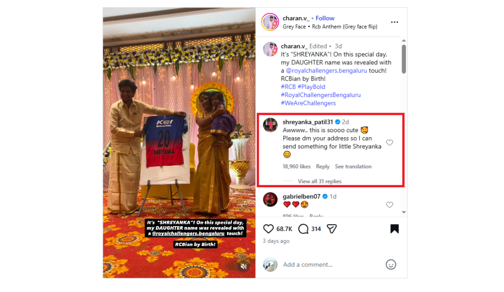рд╢реНрд░реЗрдпрдВрдХрд╛ рдкрд╛рдЯрд┐рд▓ рдиреЗ рд╕реЛрд╢рд▓ рдореАрдбрд┐рдпрд╛ рдкрд░ рд▓рд┐рдЦрд╛, ‘рдЕрд░реЗ рд╡рд╛рд╣, рдпреЗ рдмрд╣реБрдд рдкреНрдпрд╛рд░рд╛ рд╣реИ! рдкреНрд▓реАрдЬ рдореБрдЭреЗ рдЕрдкрдирд╛ рдЕрдбреНрд░реЗрд╕ DM (рдбрд╛рдпрд░реЗрдХреНрдЯ рдореИрд╕реЗрдЬ) рдХрд░реЗрдВ рддрд╛рдХрд┐ рдореИрдВ рдЫреЛрдЯреА рд╢реНрд░реЗрдпрд╛рдВрдХрд╛ рдХреЗ рд▓рд┐рдП рдХреБрдЫ рднреЗрдЬ рд╕рдХреВрдВ. рдЗрд╕ рд╡реАрдбрд┐рдпреЛ рдХреЛ рдЗрддрдирд╛ рд╢реЗрдпрд░ рдХрд┐рдпрд╛ рдЧрдпрд╛ рдХрд┐ рдпреЗ рд╕реЛрд╢рд▓ рдореАрдбрд┐рдпрд╛ рдореАрдбрд┐рдпрд╛ рдкрд░ рд╡рд╛рдпрд░рд▓ рд╣реЛ рдЧрдпрд╛. рдХреНрд░рд┐рдХреЗрдЯ рдлреИрдВрд╕ рдиреНрдпреВ рдмреЙрд░реНрди рдмреЗрдмреА рдЧрд░реНрд▓ рдХреЛ рд╢реБрднрдХрд╛рдордирд╛рдПрдВ рднреЗрдЬ рд░рд╣реЗ рд╣реИрдВ, рд╕рд╛рде рд╣реА рд╢реНрд░реЗрдпрдВрдХрд╛ рдХреЗ рд░рд┐рдкреНрд▓рд╛рдИ рдХреА рднреА рддрд╛рд░реАрдлреЗрдВ рдХрд░рддреЗ рдирд╣реАрдВ рдердХ рд░рд╣реЗ.