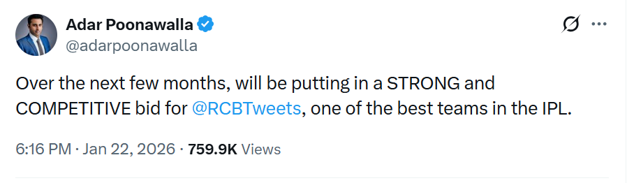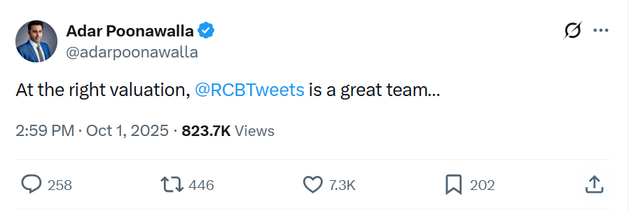 рдЕрдХреНрдЯреВрдмрд░ 2025 рдореЗрдВ рдЕрджрд╛рд░ рдкреВрдирд╛рд╡рд╛рд▓рд╛ рдиреЗ X рдкрд░ рдПрдХ рдкреЛрд╕реНрдЯ рд╢реЗрдпрд░ рдХреА рдереА, рдЬрд┐рд╕рдореЗрдВ рдХрд╣рд╛ рдерд╛, ‘рд╕рд╣реА рд╡реИрд▓реНрдпреВрдПрд╢рди рдкрд░, @RCBTweets рдПрдХ рд╢рд╛рдирджрд╛рд░ рдЯреАрдо рд╣реИ.’ рдкреВрдирд╛рд╡рд╛рд▓рд╛ рдХрд╛ рдореИрд╕реЗрдЬ рдЫреЛрдЯрд╛ рд╕рд╛ рдерд╛, рд▓реЗрдХрд┐рди рдпреЗ рд╕рд╣реА рд╡рдХреНрдд рдкрд░ рдЖрдпрд╛ рдФрд░ рдЙрджреНрдпреЛрдЧ рдХреА рдЖрд╡рд╛рдЬреЛрдВ рдХреА рддрд░рдл рд╕реЗ рдЗрд╕рдХрд╛ рдкреНрд░рдЪрд╛рд░ рдХрд┐рдпрд╛ рдЧрдпрд╛. рдкреВрд░реНрд╡ рдЖрдИрдкреАрдПрд▓ рдХрдорд┐рд╢реНрдирд░ рд▓рд▓рд┐рдд рдореЛрджреА рдиреЗ рд╕рд╛рд░реНрд╡рдЬрдирд┐рдХ рд░реВрдк рд╕реЗ рд╕реБрдЭрд╛рд╡ рджрд┐рдпрд╛ рдХрд┐ рдЖрд░рд╕реАрдмреА рдПрдХ ‘рдкреНрд░рд╛рдЗрдо рдЗрдирд╡реЗрд╕реНрдЯрдореЗрдВрдЯ’ рд╣реЛрдЧрд╛ рдФрд░ рдЗрд╕ рд╡рд┐рдЪрд╛рд░ рдХреЛ рд░рдЦрд╛ рдХрд┐ рдЧреНрд▓реЛрдмрд▓ рдпрд╛ рд╕рдВрдкреНрд░рднреБ рдлрдВрдб рдлреНрд░реИрдВрдЪрд╛рдЗрдЬрд╝реА рдХреЗ рд▓рд┐рдП рдХрддрд╛рд░ рдореЗрдВ рд▓рдЧреЗрдВрдЧреЗ, рдЬрд┐рд╕рд╕реЗ рдЕрдлрд╡рд╛рд╣реЛрдВ рдХреЛ рдмрдврд╝рд╛рд╡рд╛ рдорд┐рд▓рд╛.