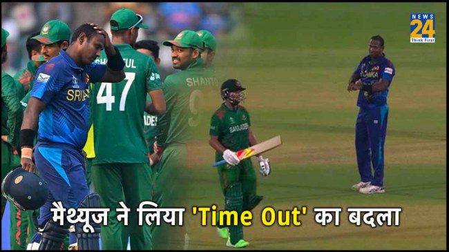 फिर जब एंजेलो मैथ्यूज गेंदबाजी पर आए तो उन्होंने शाकिल अल हसन का विकेट लिया। शाकिब ने 65 गेंदों पर 82 रनों की पारी खेली थी। मैथ्यूज ने असालंका के हाथों कैच आउट करवाकर टीम को सफलता दिलाई थी। इस विकेट के बाद वह खास अंदाज में सेलिब्रेट करते नजर आए थे। उन्होंने हाथ में घड़ी दिखाकर इशारा किया और शाकिब को पवेलियन जाते समय चिढ़ाया। इस तरह एंजेलो मैथ्यूज ने अपना बदला लिया।