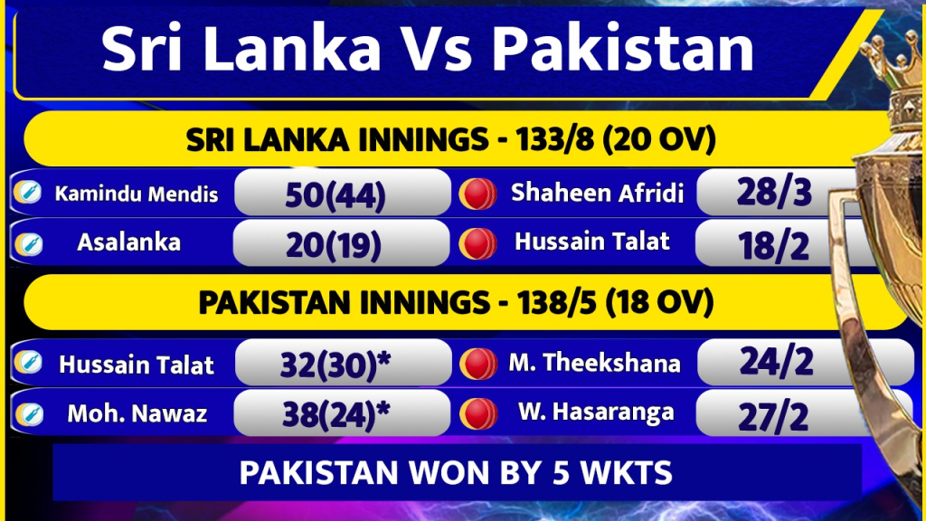 पाकिस्तान ने 5 विकेट से मुकाबला अपने नाम कर लिया है। 18 ओवर में पाकिस्तान ने 5 विकेट के नुकसान पर 138 रन बनाकर मुकाबला जीत लिया. हुसैन तलत ने 32 और मोहम्मद नवाज ने 38 रनों का योगदान दिया.