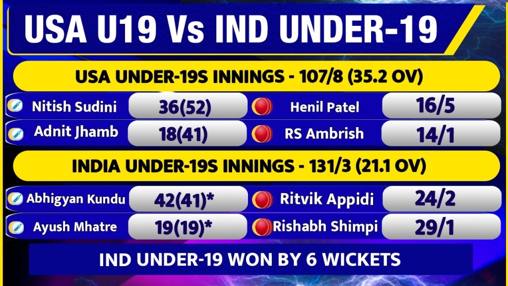 IND-U19 vs USA-U19: рдЯреАрдо рдЗрдВрдбрд┐рдпрд╛ рдиреЗ рдЕрдВрдбрд░ 19 рд╡рд░реНрд▓реНрдб рдХрдк 2026 рдХрд╛ рдЖрдЧрд╛рдЬ рдзрдорд╛рдХреЗрджрд╛рд░ рдЬреАрдд рдХреЗ рд╕рд╛рде рдХрд┐рдпрд╛ рд╣реИ. рдЖрдпреБрд╖ рдореНрд╣рд╛рддреНрд░реЗ рдХреА рдХрдкреНрддрд╛рдиреА рдореЗрдВ рднрд╛рд░рддреАрдп рдЯреАрдо рдиреЗ рдПрдХрддрд░рдлрд╛ рдореБрдХрд╛рдмрд▓реЗ рдореЗрдВ рдЕрдореЗрд░рд┐рдХрд╛ рдХреЛ 6 рд╡рд┐рдХреЗрдЯ рд╕реЗ рдорд╛рдд рджреА. рдмрд╛рд░рд┐рд╢ рд╕реЗ рдкреНрд░рднрд╛рд╡рд┐рдд рдореБрдХрд╛рдмрд▓реЗ рдореЗрдВ рдЯреАрдо рдЗрдВрдбрд┐рдпрд╛ рдХреЛ 96 рд░рдиреЛрдВ рдХрд╛ рд▓рдХреНрд╖реНрдп рдорд┐рд▓рд╛ рдерд╛, рдЬрд┐рд╕реЗ рдЯреАрдо рдиреЗ 17.2 рдУрд╡рд░ рдореЗрдВ 4 рд╡рд┐рдХреЗрдЯ рдЦреЛрдХрд░ рд╣рд╛рд╕рд┐рд▓ рдХрд░ рд▓рд┐рдпрд╛. рднрд╛рд░рддреАрдп рдЯреАрдо рдХреА рдУрд░ рд╕реЗ рдЕрднрд┐рдЬреНрдЮрд╛рди рдХреБрдВрдбреВ рдиреЗ рд╢рд╛рдирджрд╛рд░ рдмрд▓реНрд▓реЗрдмрд╛рдЬреА рдХрд░рддреЗ рд╣реБрдП 41 рдЧреЗрдВрджреЛрдВ рдореЗрдВ 42 рд░рдиреЛрдВ рдХреА рдирд╛рдмрд╛рдж рдкрд╛рд░реА рдЦреЗрд▓реА. рд╡рд╣реАрдВ, рдХрдкреНрддрд╛рди рдЖрдпреБрд╖ рдиреЗ 19 рд░рдиреЛрдВ рдХрд╛ рдпреЛрдЧрджрд╛рди рджрд┐рдпрд╛.