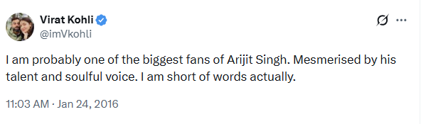 अरिजित के संन्यास के ऐलान के बाद भारत विराट कोहली के कई पुराने सोशल मीडिया पोस्ट फिर से सामने आए हैं और वायरल हो रहे हैं. एक ऐसी पोस्ट साल 2016 की है, जब कोहली ने तारीफों के पुल बांधते हुए लिखा था, ‘मैं शायद अरिजीत सिंह का सबसे बड़ा फैन हूं. उनके टैलेंट और दिल को छू लेने वाली आवाज से मोहित हूं. सचमुच में मेरे पास शब्द नहीं हैं.’