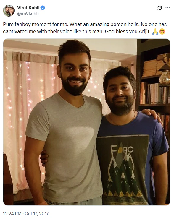 इसके अलावा विराट कोहली ने साल 2017 में एक दूसरी पोस्ट में अपनी तारीफ दोहराई थी, इसे ‘प्योर फैनबॉय मोमेंट’ बताते हुए कहा कि किसी की आवाज ने उन्हें वैसे कभी इम्प्रेस नहीं किया जैसे अरिजीत ने किया है.