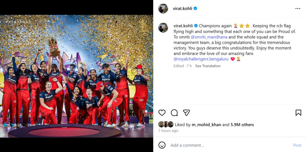 विराट कोहली ने मंधाना की टीम की तारीफ करते हुए लिखा, फिर से चैंपियंस. आरसीबी का झंडा ऊंचा रखा और ये कुछ ऐसा है जिस पर आप सभी गर्व महसूस कर सकते हैं. स्मृति और पूरी टीम और मैनेजमेंट टीम को इस शानदार जीत के लिए बहुत-बहुत मुबारकबाद. आप लोग साफ तौर से इसके हकदार हैं. इस पल का लुत्फ लें और हमारे शानदार फैंस के प्यार को महसूस करें.’