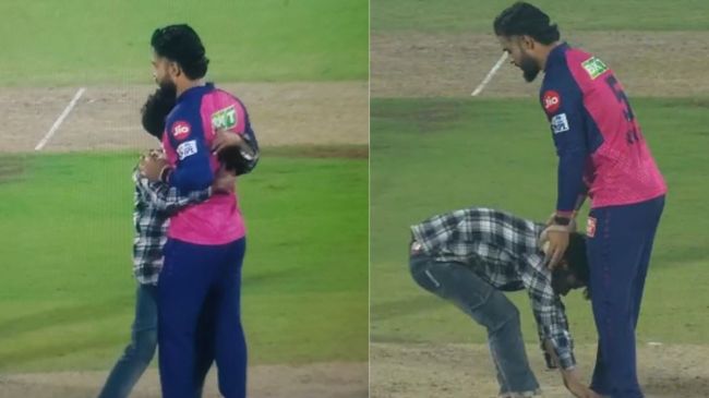 दरअसल, रियान पराग पारी का 12वां ओवर फेंकने आए थे। रियान पहली गेंद फेंकने जा ही रहे थे कि एक फैन तेजी से उनकी तरफ दौड़ता हुआ आया। फैन ने सबसे पहले रियान के पैर छुए और उसके बाद राजस्थान के कप्तान को गले से लगा लिया। इतने में ही सुरक्षाकर्मी वहां पहुंच गए और वह फैन को बाहर लेकर गए। आईपीएल 2025 में यह दूसरा मौका है, जब इस तरह से कोई फैन सुरक्षा घेरों को लांघते हुए अपने पसंदीदा क्रिकेटर से मिलने पहुंचा है। इससे पहले केकेआर और आरसीबी के बीच खेले गए मुकाबले में भी एक फैन विराट कोहली से इसी तरह से मिलने पहुंच गया था।