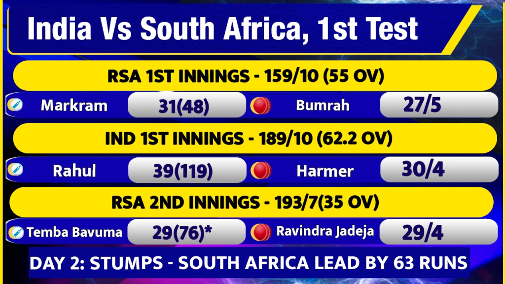 दूसरे दिन भारत की ओर से कोई भी बल्लेबाज अच्छी बल्लेबाजी नहीं कर सका. सलामी बल्लेबाज यशस्वी जायसवाल 27 गेंदों में 12 रन बनाकर पहले दिन ही आउट हो गए थे. इसके बाद दूसरे दिन केएल राहुल ने खासा प्रभावित नहीं किया. वह 119 गेंदों में 39 रनों की पारी खेलकर आउट हो गए. इसके बाद वॉशिंगटन सुंदर भी खासा कमाल नहीं कर सके. उन्होंने 82 गेंदों में 29 रन बनाए. वहीं कप्तान शुभमन गिल रिटायर्ड हर्ट हो गए. उन्होंने 3 गेंदों में 4 रन बनाए. इसके बाद ऋषभ पंत और रवींद्र जडेजा 27-27 रन बनाकर आउट हो गए. इस तरह भारतीय टीम दूसरे दिन पहली पारी में 62.2 ओवर में 189 रनों पर सिमट गई. साउथ अफ्रीका की ओर से साइमन हार्मर ने 4 और मार्को जान्सन ने 3 विकेट लिए.