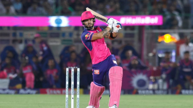 рд░рд╛рдЬрд╕реНрдерд╛рди рд░реЙрдпрд▓реНрд╕ рдХреА рддрд░рдл рд╕реЗ рдмрд▓реНрд▓реЗрдмрд╛рдЬреА рдХрд░рддреЗ рд╣реБрдП рд░рд┐рдпрд╛рди рдкрд░рд╛рдЧ рдиреЗ рддреВрдлрд╛рдиреА рдкрд╛рд░реА рдЦреЗрд▓реАред рд░рд┐рдпрд╛рди рдиреЗ 45 рдЧреЗрдВрджреЛрдВ 85 рд░рдиреЛрдВ рдХреА рдкрд╛рд░реА рдЦреЗрд▓реАред рдЕрдкрдиреА рдкрд╛рд░реА рдХреЗ рджреМрд░рд╛рди рд░рд┐рдпрд╛рди рдиреЗ 7 рдЪреМрдХреЗ рдФрд░ 6 рдЫрдХреНрдХреЗ рд▓рдЧрд╛рдП рд╣реИрдВред рд░рд┐рдпрд╛рди рдиреЗ рдЖрдЦрд┐рд░реА 21 рдмреЙрд▓ рдкрд░ 60 рд░рди рдЬрдбреЗрд╝ред рдПрдХ рд╕рдордп рд░рд╛рдЬрд╕реНрдерд╛рди рдХреА рдкрд╛рд░реА рд▓рдбрд╝рдЦрдбрд╝рд╛ рд░рд╣реА рдереА, рдЗрд╕рдХреЗ рдмрд╛рдж рдХреНрд░реАрдЬ рдкрд░ рдЖрдП рд░рд┐рдпрд╛рди рдиреЗ рд╢рд╛рдирджрд╛рд░ рдкрд╛рд░реА рдЦреЗрд▓рдХрд░ рдЯреАрдо рдХреЗ рд╕реНрдХреЛрд░ рдХреЛ 185 рд░рдиреЛрдВ рдХреЗ рд╕реНрдХреЛрд░ рддрдХ рдкрд╣реБрдВрдЪрд╛рдпрд╛ред