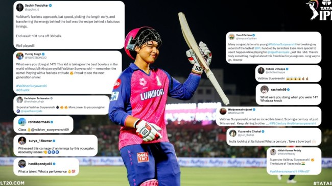उनकी बैटिंग पर महान बल्लेबाज सचिन तेंदुलकर ने ट्वीट करते हुए लिखा, ‘वैभव की निडरता, बैट स्पीड और एनर्जी ट्रांसफर ने इस शानदार पारी को जन्म दिया। नतीजा 38 गेंदों में 101 रन। शानदार खेला!’