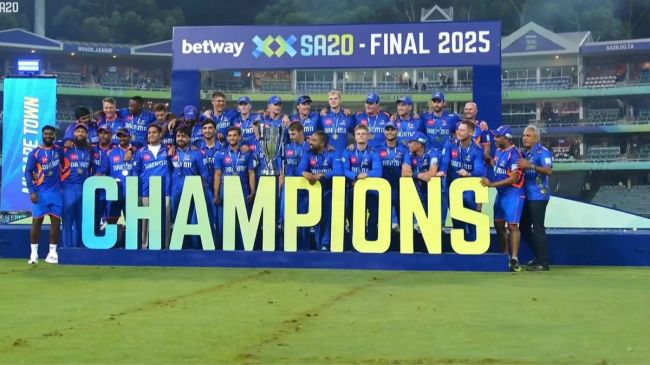 टॉस जीतकर पहले बल्लेबाजी करने उतरी एमआई की शुरुआत अच्छी रही। रेसी वेन डर डुसेन और रिकेल्टन की सलामी जोड़ी ने पहले विकेट के लिए 4.6 ओवर में 51 रन जोड़े। डुसेन 25 रन बनाकर आउट हुए, तो रिकेल्टन ने महज 15 गेंदों पर 33 रन ठोके। कॉनर एस्टरहुइजन ने 26 गेंदों का सामना करते हुए दो चौके और 2 छक्कों की मदद से 39 रन बनाए। वहीं, डेवाल्ड ब्रेविस ने अंतिम ओवरों में तेज तर्रार बल्लेबाजी करते हुए सिर्फ 18 गेंदों पर 38 रन कूटे। ब्रेविस ने अपनी आतिशी पारी में 2 चौके और 4 गगनचुंबी सिक्स लगाए। एमआई ने पहली बार खिताब को अपने नाम किया है।