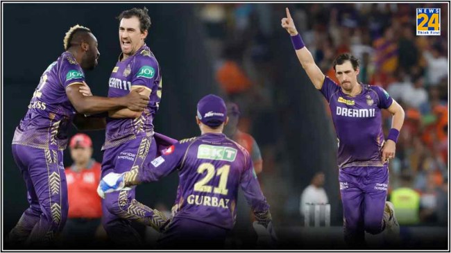 KKR vs SRH IPL 2024 Playoffs Mitchell Starc: IPL 2024 के पहले क्वालिफायर में आज कोलकाता नाइटराइडर्स के सामने सनराइजर्स हैदराबाद है। अहमदाबाद के नरेंद्र मोदी स्टेडियम में हो रही इस भिड़ंत में SRH के कप्तान पैट कमिंस ने टॉस जीता और पहले बल्लेबाजी करने का निर्णय लिया। पूरे सीजन शानदार लय में नजर आने वाली हैदराबाद क्वालिफायर 1 में फीकी नजर आई। टीम नियमित अंतराल पर विकेट गंवाती गई और 19.3 ओवर में 159 रन पर सिमट गई।