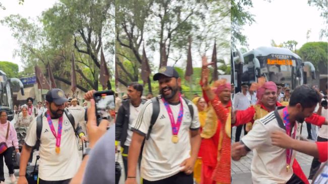 рд╣реЛрдЯрд▓ рдХреЗ рдмрд╛рд╣рд░ рдЯреАрдо рдЗрдВрдбрд┐рдпрд╛ рдХреЗ рдЦрд┐рд▓рд╛рдбрд╝рд┐рдпреЛрдВ рдХрд╛ рдвреЛрд▓-рдирдЧрд╛рдбрд╝реЛрдВ рдХреЗ рд╕рд╛рде рдЬреЛрд░рджрд╛рд░ рд╕реНрд╡рд╛рдЧрдд рдХрд┐рдпрд╛ рдЧрдпрд╛ред рдЗрд╕ рджреМрд░рд╛рди рд░реЛрд╣рд┐рдд рд╢рд░реНрдорд╛ рдФрд░ рд╕реВрд░реНрдпрдХреБрдорд╛рд░ рдпрд╛рджрд╡ рдХреЛ рдЬрдордХрд░ рдирд╛рдЪрддреЗ рд╣реБрдП рднреА рджреЗрдЦрд╛ рдЧрдпрд╛ред рдЬрд┐рд╕рдХрд╛ рд╡реАрдбрд┐рдпреЛ рд╕реЛрд╢рд▓ рдореАрдбрд┐рдпрд╛ рдкрд░ рдХрд╛рдлреА рддреЗрдЬреА рд╕реЗ рд╡рд╛рдпрд░рд▓ рд╣реЛ рд░рд╣рд╛ рд╣реИред рд░реЛрд╣рд┐рдд рдФрд░ рд╕реВрд░реНрдпрдХреБрдорд╛рд░ рдХреЗ рджреЗрд╢реА рдбрд╛рдВрд╕ рдиреЗ рдлреИрдВрд╕ рдХрд╛ рджрд┐рд▓ рдЬреАрдд рд▓рд┐рдпрд╛ред