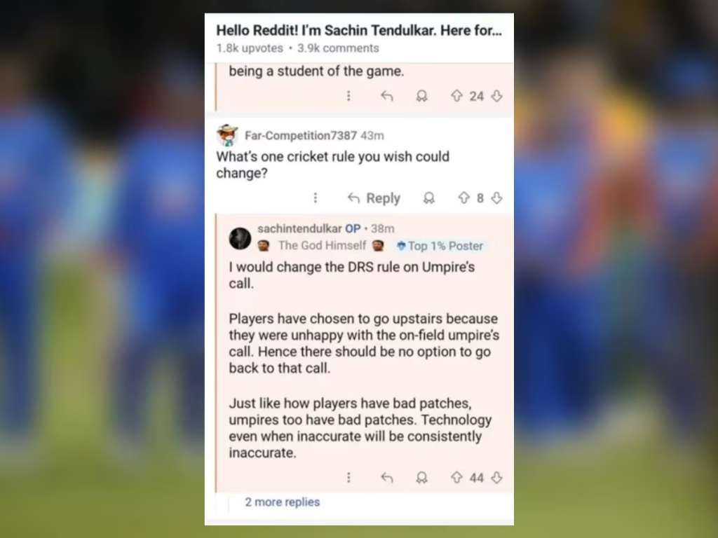 रेडिट पर एक फैन ने सचिन तेंदुलकर से सवाल करते हुए पूछा कि आप क्रिकेट के किस नियम में बदलाव चाहते हैं? इसका जवाब देते हुए सचिन ने कहा “मैं डीआरएस को बदलना चाहूंगा। क्योंकि खिलाड़ी फील्ड अंपायर के फैसले से नाखुश होकर डीआरएस का इस्तेमाल करके थर्ड अंपायर के पास जाते हैं। मेरा मानना है कि उस फैसले पर वापस जाने का कोई विकल्प नहीं होना चाहिए। जैसे खिलाड़ियों का खराब दौर आता है, वैसे ही अंपायरों का भी खराब दौर आता है। टेक्नोलॉजी गलत होने पर गलती लगातार रहेगी ही।”