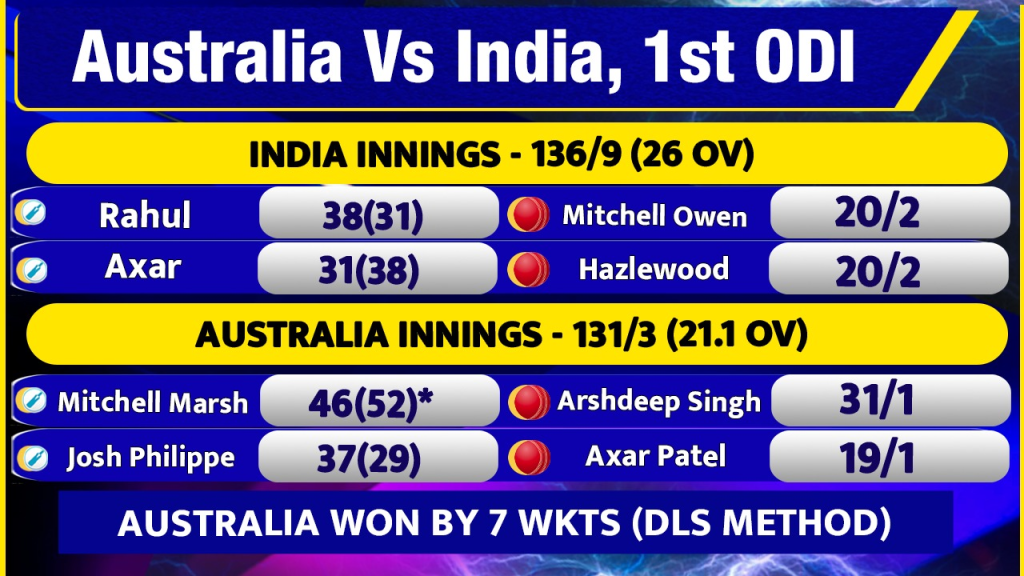 पहले बल्लेबाजी करते हुए भारत ने 26 ओवर में 136 रन बनाए थे. बारिश की वजह से मुकाबला 26 ओवर का कर दिया गया था. भारत की ओर से रोहित शर्मा 14 गेंदों में 8 रन बनाकर आउट हुए, जबकि शुभमन गिल 18 गेंदों में 10 रन बनाकर पवेलियन लौटे. वहीं विराट कोहली का भी खाता नहीं खुला. वह 8 गेंदों में 0 रन बनाकर मिचेल स्टार्क का शिकार बने. अंत में केएल राहुल ने 31 गेंदों में 38 रन बनाए, जबकि अक्षर पटेल ने 38 गेंदों में 31 रन बनाए.