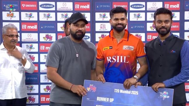 Indian ODI Captain Rohit Sharma & T20 Mumbai League Chairman Vihang Sarnaik giving the Runner-up Prize to Captain Shreyas Iyer 👌 pic.twitter.com/tOLSY6nTQT