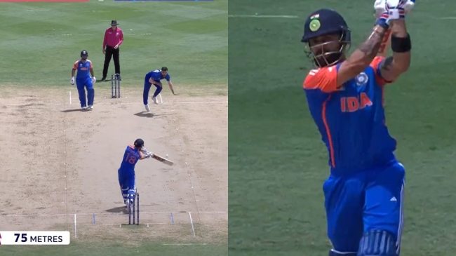 विराट कोहली ने अफगानिस्तान के गेंदबाज नवीन उल हक की जमकर कुटाई की। ये नजारा पांचवें ओवर में देखने को मिला। नवीन उल हक की पहली गेंद पर विराट कोहली ने 2 रन लिए। इसके बाद दो गेंदें खाली निकलीं। फिर चौथी पर बड़ा शॉट लगाने की फिराक में बैठे कोहली ने बेखौफ अंदाज अपनाया। नवीन ने जैसे ही ये बॉल फेंकी, विराट ने आगे बढ़कर बल्ले का मुंह खोला और ऑफ स्टंप से दूर जाती गेंद पर डाउन द ग्राउंड छक्का जमा दिया। विराट का ये छक्का इतना कड़क था कि बॉल सीधा स्क्रीन पर जाकर लगी। ये नजारा देख नवीन उल हक का मुंह बन गया। नवीन के इस ओवर से कुल 9 रन आए।