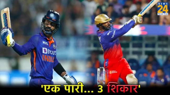 T20 WC 2024 Dinesh Karthik: आईसीसी टी20 विश्व कप 2024 से पहले भारत के दिग्गज खिलाड़ी दिनेश कार्तिक ने टीम सेलेक्टर की टेंशन बढ़ा दी है। आईपीएल के आगाज से पहले कार्तिक भारतीय टीम में शामिल होने की रेस में भी नहीं थे। लेकिन अब उन्होंने रॉयल चैलेंजर्स बेंगलुरु के लिए खेलते हुए ऐसा फॉर्म दिखाया कि स्क्वाड तो फिर भी दूर की बात है, कार्तिक को विश्व कप के लिए भारतीय टीम की प्लेइंग इलेवन में शामिल करने की चर्चा शुरू हो गई है। दिनेश ने मुंबई इंडियंस के खिलाफ सिर्फ 22 गेंदों में 52 रनों की पारी खेली। कार्तिक की इस शानदार फॉर्म ने भारत के 3 विकेटकीपर्स की टेंशन बढ़ा दी है। कार्तिक इन 3 खिलाड़ियों का टीम से पत्ता काट सकते हैं।