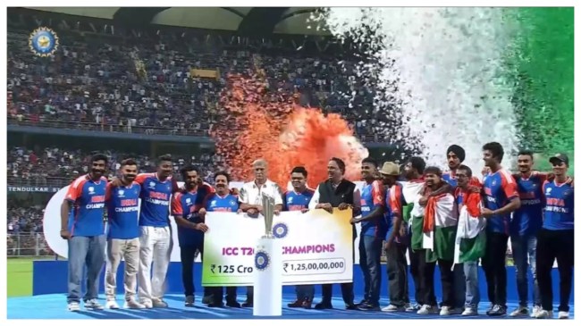 Team India: рдЯреАрдо рдЗрдВрдбрд┐рдпрд╛ рдЯреА20 рд╡рд░реНрд▓реНрдб рдХрдк 2024 рдЬреАрддрдХрд░ рд╡рд╛рдкрд╕ рд▓реМрдЯ рд╕реНрд╡рджреЗрд╢ рдЖрдИ рд╣реИред рдЗрд╕ рджреМрд░рд╛рди рдЯреАрдо рдЗрдВрдбрд┐рдпрд╛ рдХрд╛ рд╕рдореНрдорд╛рди рдореБрдВрдмрдИ рдХреЗ рд╡рд╛рдирдЦреЗрдбрд╝реЗ рд╕реНрдЯреЗрдбрд┐рдпрдо рдореЗрдВ рдХрд┐рдпрд╛ рдЧрдпрд╛ред рдмреАрд╕реАрд╕реАрдЖрдИ рдХреА рддрд░рдл рд╕реЗ рдЯреАрдо рдЗрдВрдбрд┐рдпрд╛ рдХреЛ 125 рдХрд░реЛреЬ рд░реБрдкрдП рдХрд╛ рдЗрдирд╛рдо рджрд┐рдпрд╛ рдЧрдпрд╛ред рдЗрд╕рдХреЗ рд▓рд┐рдП рдкреВрд░реА рдЯреАрдо рдЗрдВрдбрд┐рдпрд╛ рдХреЛ рд╕реНрдЯреЗрдЬ рдкрд░ рдмреБрд▓рд╛рдпрд╛ рдЧрдпрд╛ред рд╕рдореНрдорд╛рди рд▓реЗрдиреЗ рдХреЗ рдмрд╛рдж рдЦрд┐рд▓рд╛реЬрд┐рдпреЛрдВ рдиреЗ рдЯреНрд░реЙрдлреА рдХреЗ рд╕рд╛рде рдореИрджрд╛рди рдореЗрдВ рд╡рд┐рдХреНрдЯреНрд░реА рд▓реИрдк рдХреАред