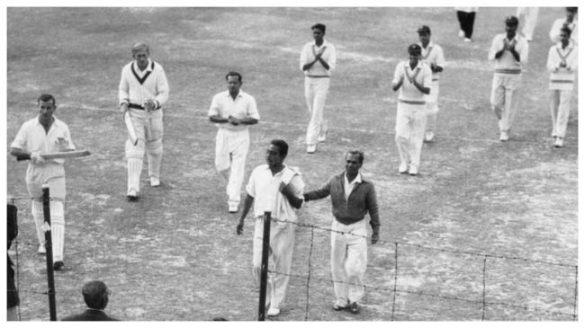 GS Ramchand congratulates Jasu Patel on his 14-wicket performance, India vs Australia, Kanpur, 1959. Ramchand had initially given Patel the wrong end, but the off spinner persuaded the captain to let him switch ends, pitched the ball in Davidson’s footmarks and created havoc. pic.twitter.com/2NYqf3Zk0B