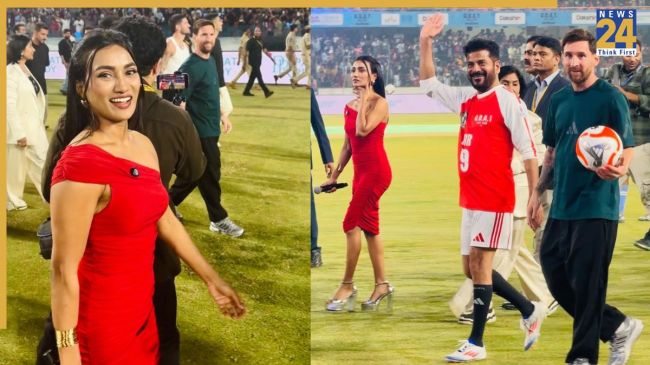 Sharmila Kasala With Lionel Messi: लियोनेल मेसी का GOAT India Tour जब 13 दिसंबर 2025 को हैदराबाद पहुंचा, तब वो राजीव गांधी इंटरनेशनल स्टेडियम में अपने फैंस से मुखाबित हुए. उनका स्वागत करने के लिए खुद तेलंगाना के सीएम रेवंत रेड्डी और लोकसभा में विपक्ष के नेता राहुल गांधी भी मौजूद थे. इस दौरान रेड आउटफिट ने नजर आने वाली स्पोर्ट्स प्रेजेंटर पर हर किसी की निगाहें थम सी गईं. आइए जानते हैं कि ये हसीना आखिर है कौन.