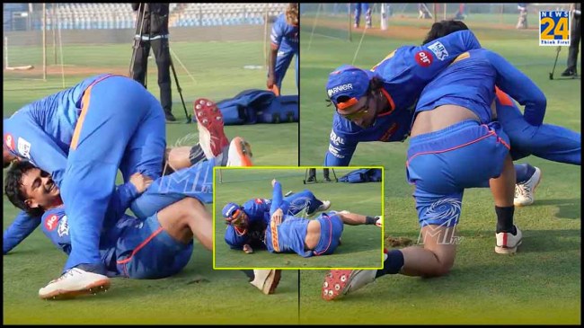 Ishan Kishan Tim David Wrestling: इंडियन प्रीमियर लीग 2024 (IPL 2024) के 67वें मैच में शुक्रवार को मुंबई इंडियंस का सामना लखनऊ सुपर जायंट्स से होगा। यह भिड़ंत मुंबई के वानखेड़े स्टेडियम में होगी। इस मैच से पहले मुंबई इंडियंस ने सोशल मीडिया पर एक वीडियो शेयर किया है। इस वीडियो में MI के 2 खिलाड़ी रेसलिंग में हाथ आजमाते नजर आ रहे हैं। वीडियो के साथ कैप्शन में लिखा गया है, ‘चेतावनी: ये प्रशिक्षित पेशेवर हैं, इसे घर पर न आज़माएं।’