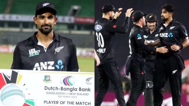 Bangladesh vs New Zealand 2nd ODI Ish Sodhi Player Of The Match: बांग्लादेश-न्यूजीलैंड के बीच वर्ल्ड कप से पहले खेली जा रही तीन मैचों की वनडे सीरीज का दूसरा मैच ऑलराउंडर ईश सोढ़ी के नाम रहा। न्यूजीलैंड के धाकड़ खिलाड़ी ने बल्ले से 39 गेंदों में 35 रन ठोके, तो वहीं दूसरी ओर उन्होंने गेंदबाजी में भी कमाल किया। सोढ़ी ने 10 ओवर में 39 रन देकर 6 विकेट चटकाए।