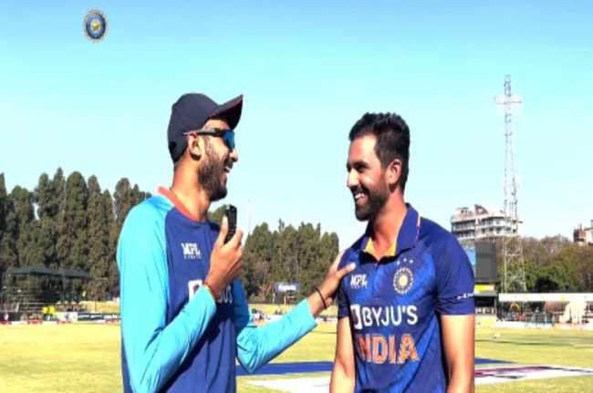 नई दिल्ली: टीम इंडिया जिम्बाब्वे के दौरे पर है। तीन मैचों की वनडे सीरीज में पहला मैच भारत ने 10 विकेट से अपने नाम कर लिया है। पहले बल्लेबाजी करते हुए जिम्बाब्वे की पूरी टीम 189 पर ऑलआउट हो गई। चोट के बाद वापसी कर रहे दीपक चाहर ने 27 रन देकर तीन विकेट लिए। चाहर ने टॉप के बल्लेबाजों को चलता किया। मैच के बाद चाहर और अक्षर पटेल ने बीसीसीआई टीवी पर बात की और इस दौरान दोनों ने मिलकर युजवेंद्र चहल की टांग खिंची।