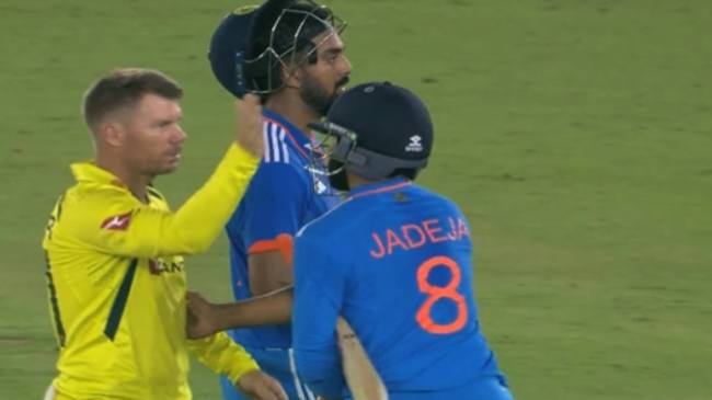 David Warner slaps Ravindra Jadeja: भारत और ऑस्ट्रेलिया (India vs Australia) के बीच खेली जा रही वनडे सीरीज का पहला मैच मेजबान टीम ने 5 विकेट से जीत लिया। मैच में विजयी छक्का भारतीय टीम के कप्तान केएल राहुल ने लगाया। जिसके बाद जहां ऑस्ट्रेलियाई खिलाड़ियों ने क्रीज पर मौजूद केएल राहुल रवींद्र जडेजा से हाथ मिलाया। वहीं दूसरी ओर डेविड वॉर्नर मस्ती के मूड में नजर आए।