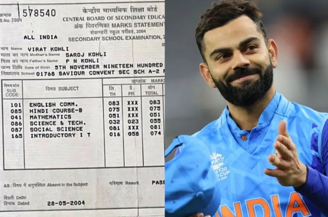 क्रिकेट मैदान में अब तक अनगिनत रिकॉर्ड को अपने नाम कर चुके विराट कोहली ने साल 2004 में 10वीं की परीक्षा को पास किया था। उन्होंने अंग्रेजी में 83, हिंदी में 75, गणित में 51, साइंस में 55, सोशल साइंस में 81 और इंट्रोडक्टरी आइटी में 74 अंक हासिल किए थे। उनके सिर्फ इंग्लिश विषय में ही A1 ग्रेड आई थी। हिंदी में B1, मैथ्स में C2, साइंस में C1, सोशल साइंस में A2 और इंट्रोडक्टरी आइटी में C2 ग्रेड प्राप्त की थी। कोहली ने गुरुवार को अपनी 10वीं की मार्कशीट माइक्रो ब्लॉगिंग प्लेटफॉर्म कू पर शेयर की थी।