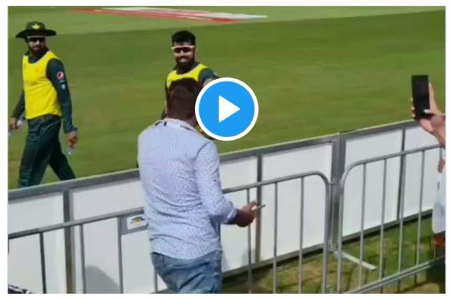 तीसरे मैच के दौरान एक फैन ने जो किया उसे देख सब हैरान रह गए। दरअसल शादाब खान और हैरिस राउफ को लास्ट मैच में आराम दिया गया था। दोनों खेल रहे खिलाड़ियों के लिए ड्रिंक्स ले जाने का काम कर रहे थे। मैच के दौरान एक फैन बाउंड्री लाइन के पास पहुंचा और जब ये खिलाड़ी ड्रिंक्स लेकर जा रहे थे, तो फैन ने तुरंत उसमें से दो बोतल उठा ली। इस पर हैरान होकर शादाब ने कहा, ”एक ही पकड़ ना। हालांकि हैरिस खुश नहीं नजर आए।