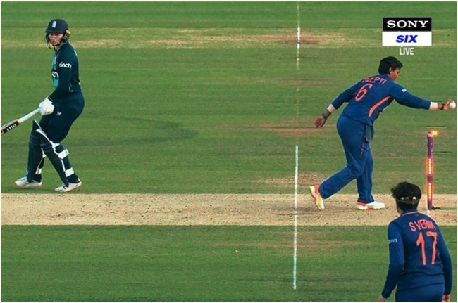 हालांकि इंग्लैंड के फैंस इससे काफी निराश दिखाई दिए, लेकिन दीप्ति की सूझबूझ भरी फील्डिंग ने इंग्लैंड के जबड़े से मैच निकाल लिया। ये बिलकुल वैसा ही नजारा था जैसे लगान फिल्म में अंग्रेज क्रिकेट मैच खेलते हुए करते हैं। आमिर खान को गेंद डालते वक्त गेंदबाज दूसरे छोर पर खड़े बल्लेबाज को आउट कर देता है। उल्लेखनीय है कि आईसीसी की ओर से मांकडिंग रनआउट को लीगल करार दिया जा चुका है।
