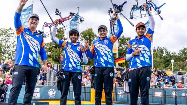 World Archery Championships: ज्योति सुरेखा वेन्नम, परनीत कौर और अदिति गोपीचंद स्वामी की भारतीय महिला कंपाउंड टीम ने शुक्रवार को बर्लिन में आयोजित विश्व तीरंदाजी चैंपियनशिप 2023 में स्वर्ण पदक जीत लिया। यह किसी भी वर्ग में तीरंदाजी विश्व चैंपियनशिप में भारत का पहला स्वर्ण पदक है। स्वर्ण पदक फाइनल में तीनों भारतीय खिलाड़ियों ने मैक्सिको की टीम डैफने क्विंटेरो, एना सोफा हर्नांडेज जियोन और एंड्रिया बेसेरा को 235-229 से हराया।