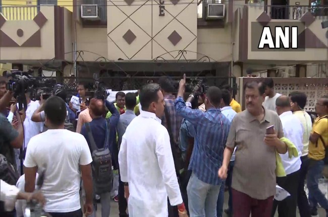Bihar | Supporters of Sunil Singh, RJD MLC and Chairman of Biscomaun Patna, gather outside his residence in Patna in protest against the CBI raid here.