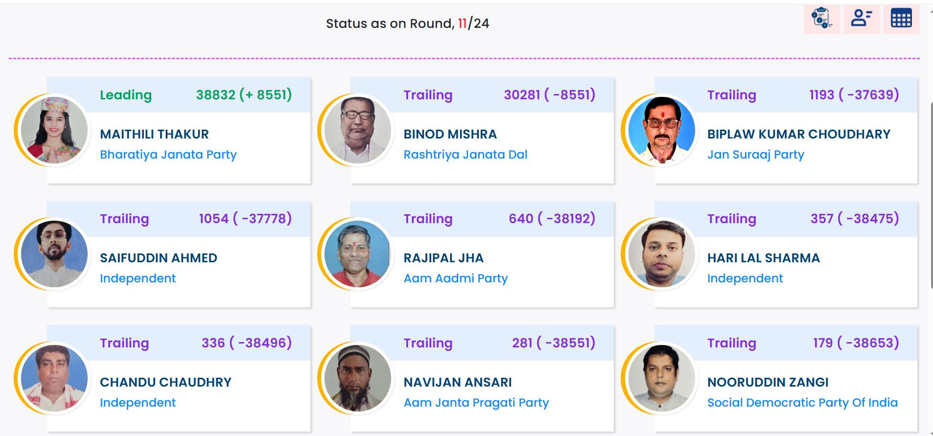 मैथिली ठाकुर 8693 की बढ़त से आगे. गिनती का 17वां राउंड हुआ पूरा.