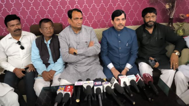 Former Minister Shahnawaz Hussain In Kishanganj (अब्दुल करीम): बिहार में विधानसभा चुनाव से पहले शनिवार को भाजपा के राष्ट्रीय प्रवक्ता सह पूर्व मंत्री शाहनवाज हुसैन किशनगंज पहुंचे। जहां भाजपा नेता हरिराम अग्रवाल के आवास पर प्रेस कॉन्फ्रेंस में उन्होंने राज्य में फिर से एक बार NDA सरकार बनाने का दावा किया। वहीं, उन्होंने भाजपा के प्रदेश अध्यक्ष डॉ. दिलीप कुमार जायसवाल की तारीफ करते हुए कहा कि डॉ. जायसवाल ने मंत्री होने के नाते बहुत अच्छा काम किया है। हुसैन ने कहा कि पूरी ताकत से नीतीश कुमार के नेतृत्व में चुनाव लड़ेंगे और फिर से उनके नेतृत्व में सरकार बनाएंगे।