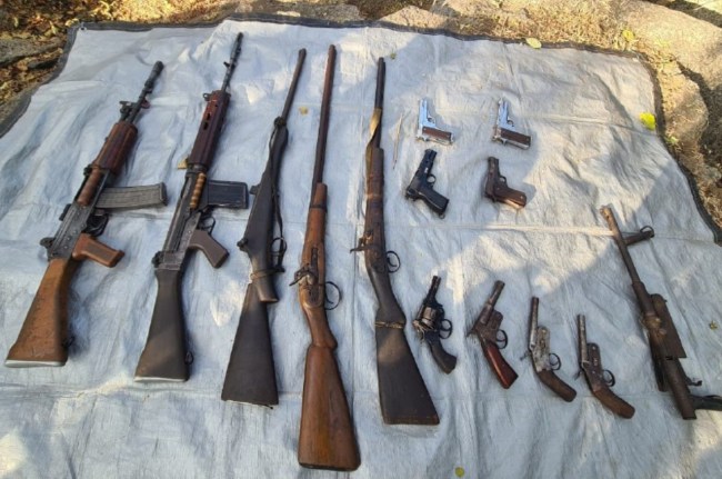 सैनिकों को यहां शिलाखंडों के बीच छिपा हुआ एक काला पैकेट मिला। जब सैनिकों ने पैकेट खोला और आगे की तलाशी ली तो उन्होंने एक इंसास राइफल, एसएलआर, बोल्ट एक्शन राइफल, 9 एमएम पिस्टल, तीन मैगजीन के साथ देसी पिस्तौल, 3 कट्टा, 2 भरमार बंदूकें, रिवॉल्वर, थर्नेट (एएन) बरामद की।